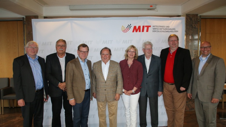Bild: Der neue Kreisvorstand der MIT Rendsburg-Eckernförde (v.l.): Hans-Jürgen Schröder, Ulli Frank, Jo Wadephul, MdB, Kreisvorsitzender Günter Kohl, Kirsten Klauza, Günter Dittmer, Olaf Bockholt, Landesvorsitzender Stefan Lange