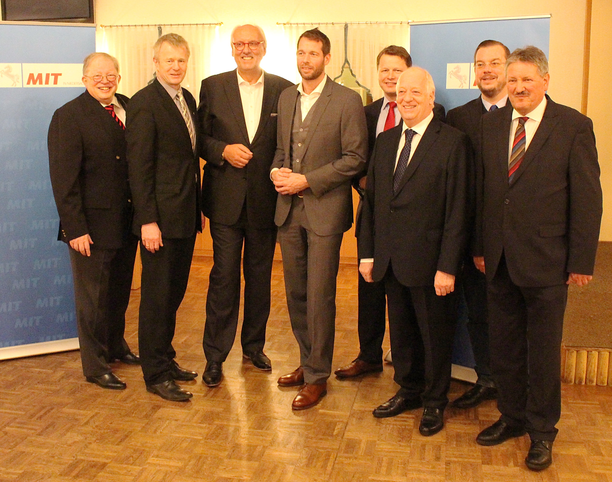 Foto (v.l.): Andreas Sobotta, Gerd Conens, Wilhelm Schulte, Bodo Janssen, Georg Gerdes, Ernst-Otto Cordes, Jan-Peter Bechtluft und Landrat Reinhard Winter.