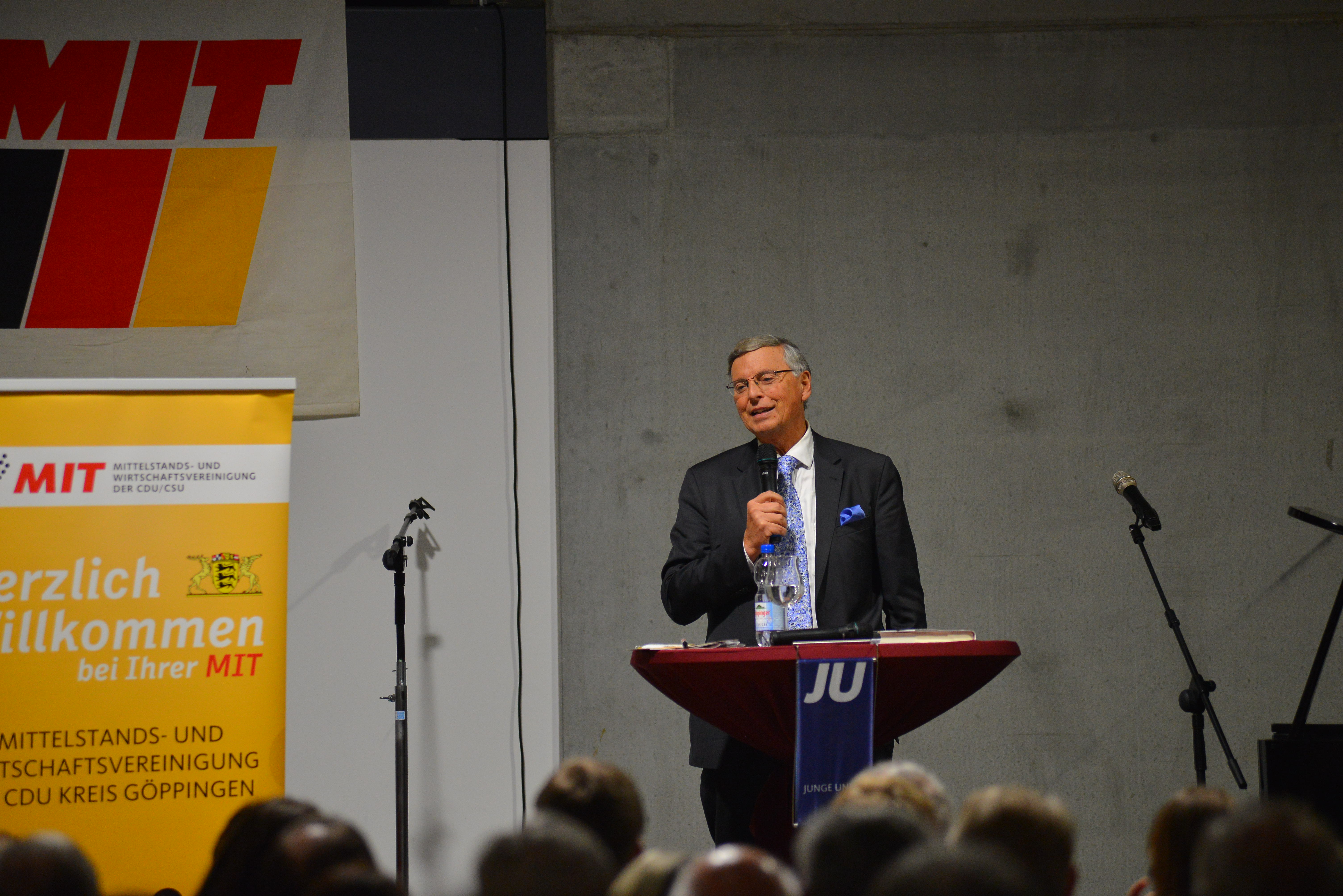 In Ulm gelandet, musste der Hauptredner beim Politischen Herbstfest von MIT und JU der CDU bei der Firma Lambert mit dem Auto nach Göppingen gefahren werden. Kurzerhand stellte MIT-Kreisvorsitzender Eduard Freiheit das Programm um und die zahlreichen Besucher und Ehrengäste nahmen es nach der gemeinsamen Begrüßung durch JU-Kreisvorsitzenden Simon Weißenfels und MIT-Vorsitzenden Eduard Freiheit locker. Als Bosbach eintraf, wurde er frenetisch von 280 Gästen begrüßt. Bei seinem Vortrag „Wie ist unser Kompass für die Zukunft Deutschlands?“ streifte er eine Fülle von politischen Themen: Außenpolitik, Innenpolitik, Wirtschaft, die Bedeutung Europas für Frieden und Freiheit und der Wandel von der Industriegesellschaft zur Wissensgesellschaft.