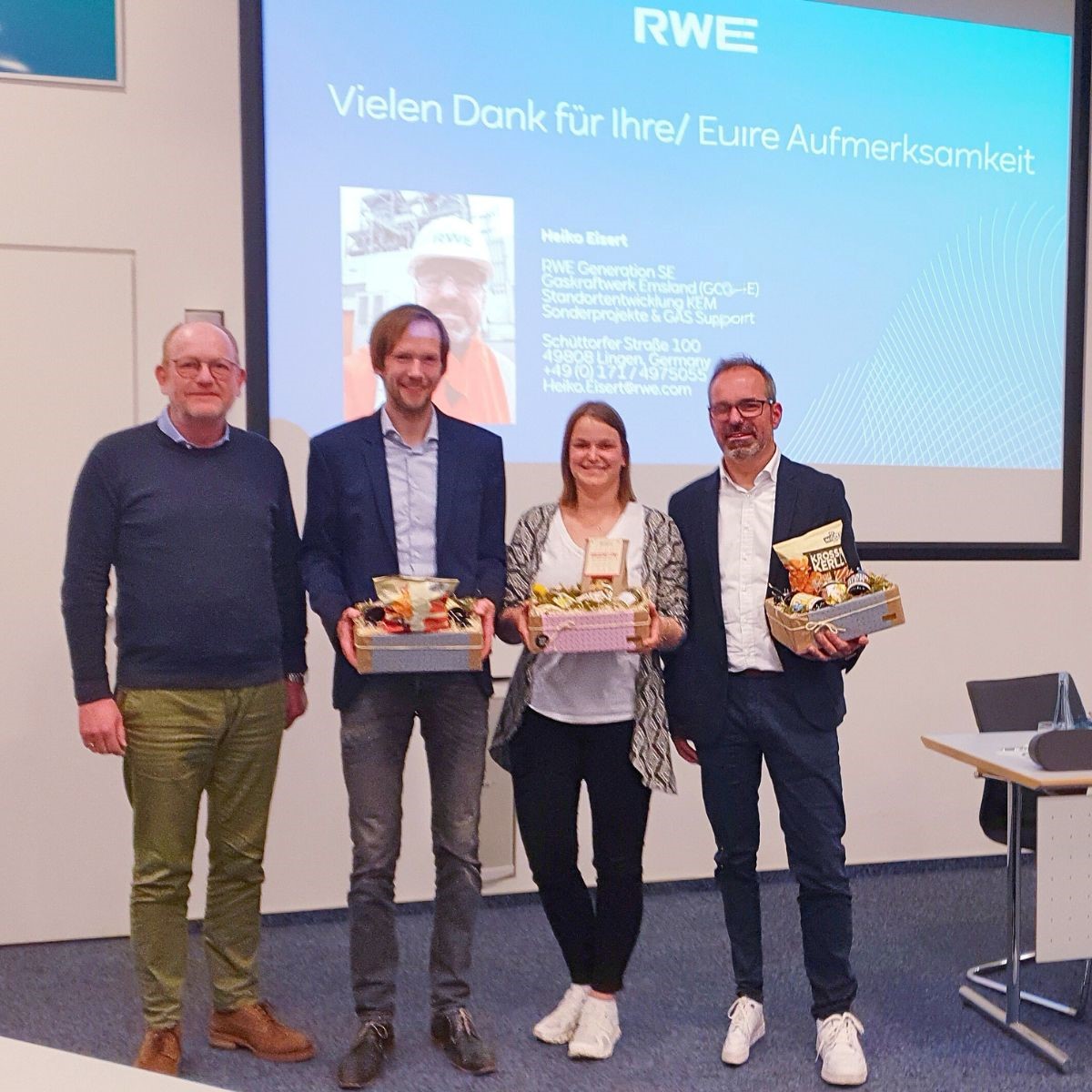 Bild 1: v. l. Wolfgang Paus (MIT KV Lingen), Dr. Tim Husmann (H2-Region Emsland), Anna-Lena Meyer (RWE), Heiko Eisert (RWE)