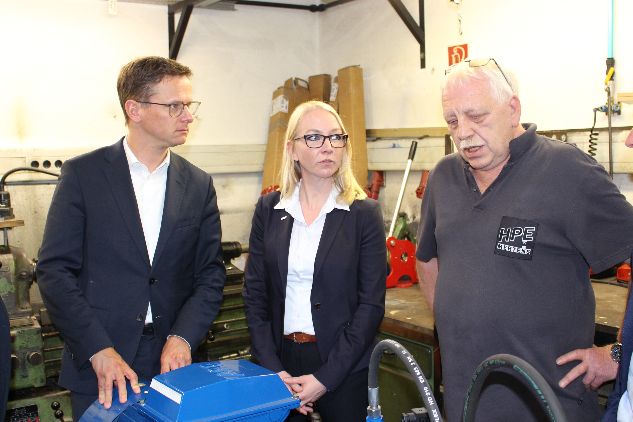 Linnemann, der auch stellvertretender Vorsitzender der CDU/CSU-Bundestagsfraktion ist, zeigte sich von dem seit 20 Jahren existenten Sieben-Mann-Unternehmen für die Bereiche Hydraulik, Pneumatik und Elektronik beeindruckt. Die Geschäftsführer Michael Mertens und Robin Benecke standen Rede und Antwort. 2009 entwickelten Mertens und Benecke eine Hydraulikanlage für Glas- und Steinmühlen. Gerade die Sorgen und Nöte kleiner und mittlerer Unternehmen interessierten den MIT Bundesvorsitzenden, da sie vielfach in der öffentlichen Wahrnehmung und Berichterstattung zu kurz kämen. Bürokratische Hemmnisse wie die Bestimmungen der Datenschutzgrundverordnung (DSGVO), die Facharbeitersituation, aber auch die Unklarheiten im Zuge des zu erwarteten BREXITs belasteten. „Wir machen das, wo andere bereits kapituliert haben“, so Michael Mertens. „Für unsere Auftraggeber ist HPE so etwas wie eine Feuerwehr, wenn’s brennt.“, so Mertens weiter. An der Firmenbesichtigung nahmen auch teil Vorständler der MIT Wedemark, des MIT Kreisverbandes Hannover-Land und des MIT-Bezirksvorstandes Hannover. Foto: Andreas Sobotta, Hannover (Veröffentlichung honorarfrei) (v.l.n.r.): Dr. Carsten Linnemann MdB, Silke Hanebuth vom Vorstand der MIT Wedemark und Firmenchef Michael Mertens im Gespräch.