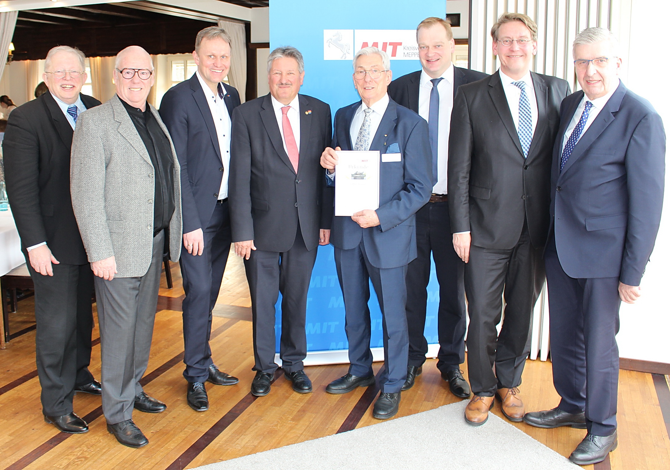 Kürzlich fand die Mitgliederversammlung der Mittelstands- und Wirtschaftsunion Meppen – früher Mittelstands- und Wirtschaftsvereinigung der CDU Meppen - im Alten Gasthaus Kamp in Meppen statt. Als Ehrengäste wurden begrüßt der Europaabgeordnete Jens Giesecke, der Bundestagsabgeordente Albert Stegemann, der Landtagsabgeordnete Bernd Carsten Hiebing, der Landrat des Emslandes, Marc-André Burgdorf, und der stellvertretende Landesvorsitzende der Niedersachsen-MIT, H.-Dieter Klahsen. Der Hauptgeschäftsführer der Niedersachsen-MIT, Andreas Sobotta, wurde mit der Leitung der Wahlhandlungen betraut. Reinhard Winter, der frühere Landrat des Emslandes, wurde einstimmig zum MIT-Kreisvorsitzenden nachgewählt. Der bisherige Kreisvorsitzende Günter Reisner, der das Amt 18 Jahre innehatte, übergibt einen Verband mit über 400 eingeschriebenen Mitgliedern. Die MIT Meppen ist die zweitgrößte Gliederung innerhalb der Niedersachsen-MIT und die fünftgrößte Gliederung auf Bundesebene. Die Versammlung wählte Günter Reisner einstimmig zu ihrem Ehrenvorsitzenden. Zuvor war die Satzung geändert worden, damit dieser Wahlgang überhaupt stattfinden konnte. 17 Mitglieder des Verbandes wurden für ihre langjährigen Mitgliedschaften mit Ehrenurkunde und Ehrennadel ausgezeichnet. Im Frühjahr kommenden Jahres finden die Neuwahlen des Gesamtvorstandes statt. Der neue Kreisvorsitzende Reinhard Winter setzt auf Teamgeist. Die MIT Meppen will auch künftig mit interessanten Veranstaltungen aufwarten. So sind in 2020 eine Fahrt nach Bonn, Veranstaltungen zum Brexit mit seinen Auswirkungen auf die heimische Wirtschaft und zum Thema Wasserstoff vorgesehen. Foto: Holger Cosse Text Foto: (v.l.n.r.): Andreas Sobotta, H.-Dieter Klahsen, Jens Gieseke MdEP, Reinhard Winter, Günter Reisner, Albert Stegemann MdB, Marc-André Burgdorf und Bernd-Carsten Hiebing MdL