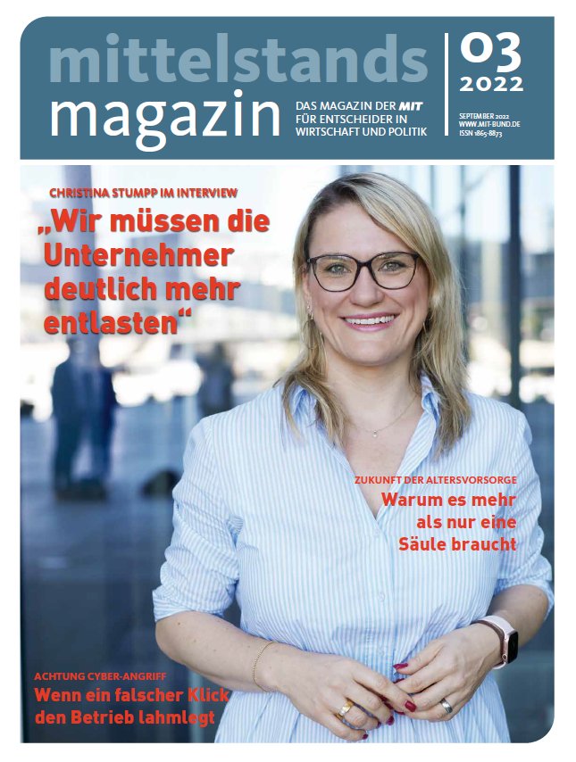 Datum des Artikels 07.09.2022 MittelstandsMagazin Eine neue Ausgabe des Mittelstandsmagazins ist da. Die neue stv. Generalsekretärin Christina Stumpp im Interview. Mehr zum Thema DateiDownload (5 MB) Empfehlen Sie uns!Bei Facebook teilen Bei Twitter (X) teilen Bei Whatsapp teilen Diese Seite drucken Diese Seite einem Freund schicken