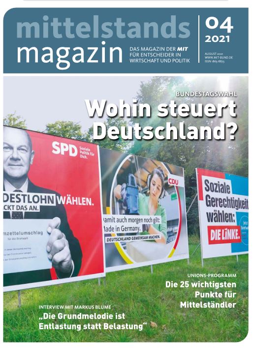 Eine neue Ausgabe des Mittelstandsmagazins ist da. CSU-Generalsekretär Markus Blume stellt im Interview klar: „Die Grundmelodie ist Entlastung statt Belastung." Klimaneutrales fliegen - geht das? Außerdem werfen wir einen Blick ins Wahlprogramm der Union: Das sind die wichtigsten 25 Punkte aus Sicht des Mittelstandes. Im Pro und Contra diskutieren Friedrich Merz und Michael Grosse-Brömer über die Frage: Sollten Regierungsämter vermehrt durch externe Experten besetzt werden?