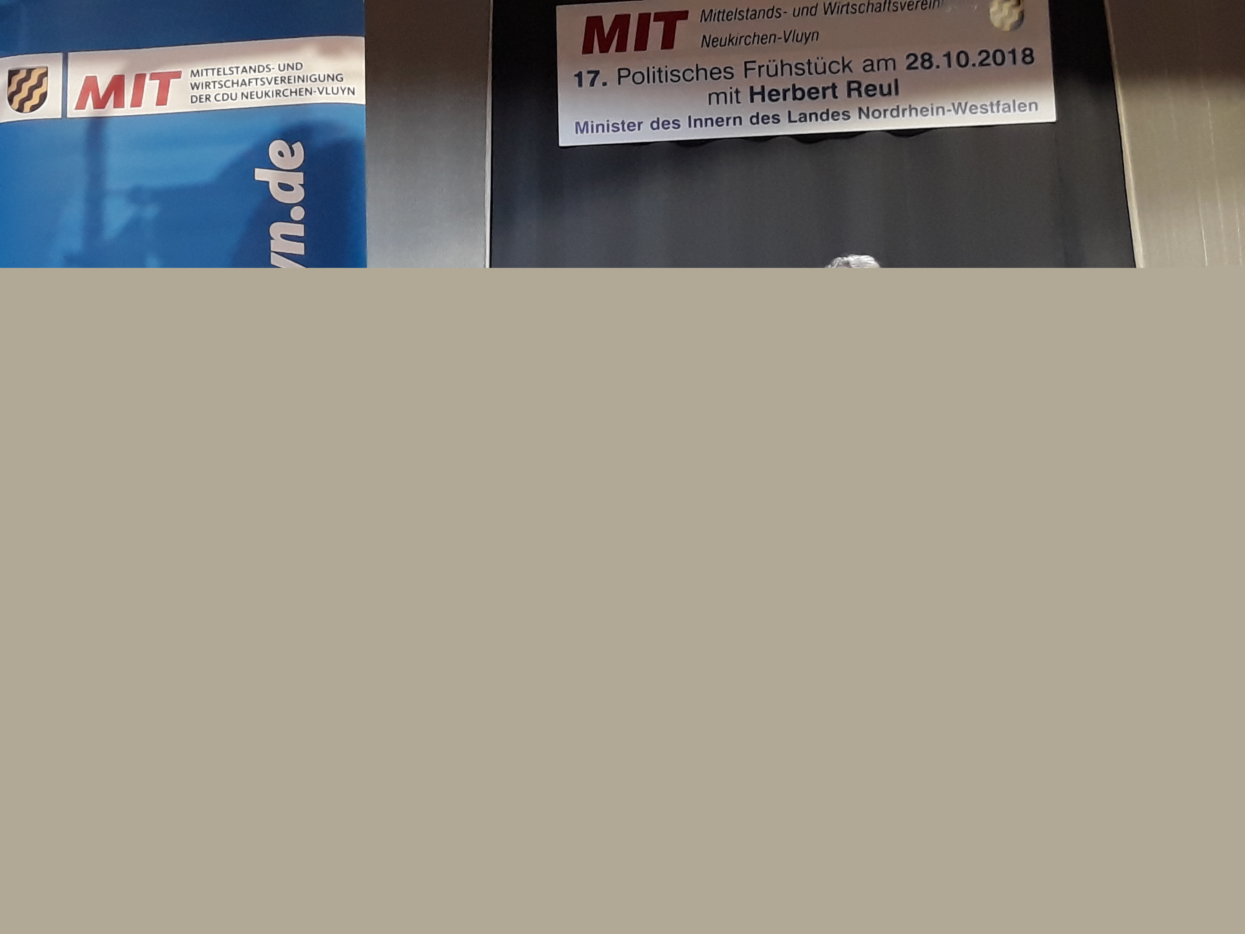 Über 200 Personen waren zu einem begeistern und kraftvollen Rede des NRW- Innenminister Herbert Reul am letzten Oktobersonntag gekommen. Und die Zuhören wurden nicht enttäuscht. Ganz im Gegenteil. Herbert Reul erläuterte die neue Innenpolitik in NRW detailliert. Null Tolleranz ist seine Maxime. MIT-Vorsitzender Michael Darda mit seinem MIT-Vorstands-Team hatten mit Redner Reul und dem leckeren Frühstück wieder alles zum 17.MIT-Frühstück richtig gemacht. Zum Abschied für den "Sonntagseinsatz bei der MIT" erhielt Herbert Reul von MIT-Bezirksvorsitzenden Maik Giesen und Michael Darda ein Bild mit Landschaft, aber nicht den Hambacher Forst ! Er freute sich riesig über das Bild und stand anschließend für Kurzgespräche und Fotowünsche gerne zur Verfügung.